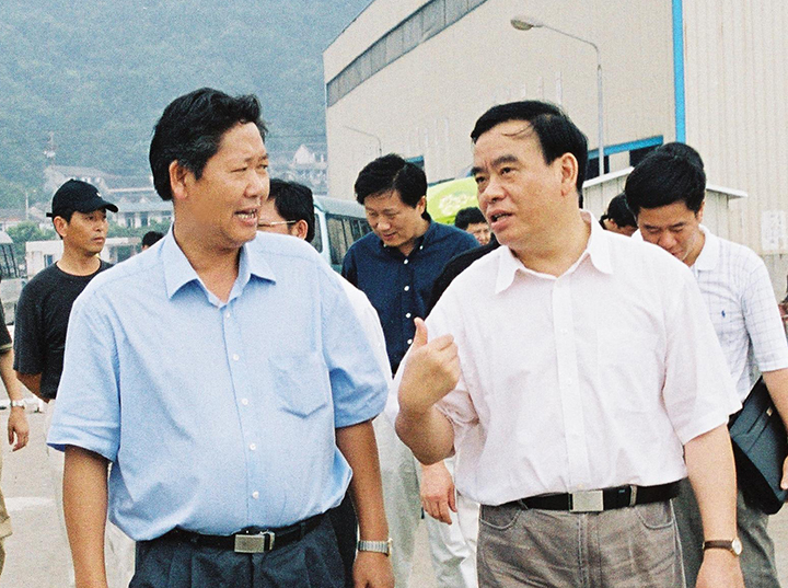 2003年8月8日,浙江省委副書記、省長(zhǎng)呂祖善(右一)來“揚(yáng)帆”視察,要求揚(yáng)帆集團(tuán)依托舟山的港口和區(qū)位優(yōu)勢(shì),拓展發(fā)展思路,創(chuàng)新管理機(jī)制,抓住船舶工業(yè)發(fā)展的有利機(jī)遇,進(jìn)一步做大做強(qiáng)。