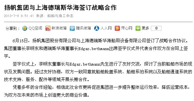 船舶與海工:揚帆集團(tuán)與上海德瑞斯華海簽訂戰(zhàn)
