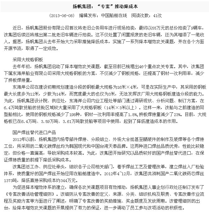 中國(guó)船舶在線:揚(yáng)帆集團(tuán):“專(zhuān)案”推動(dòng)降成本